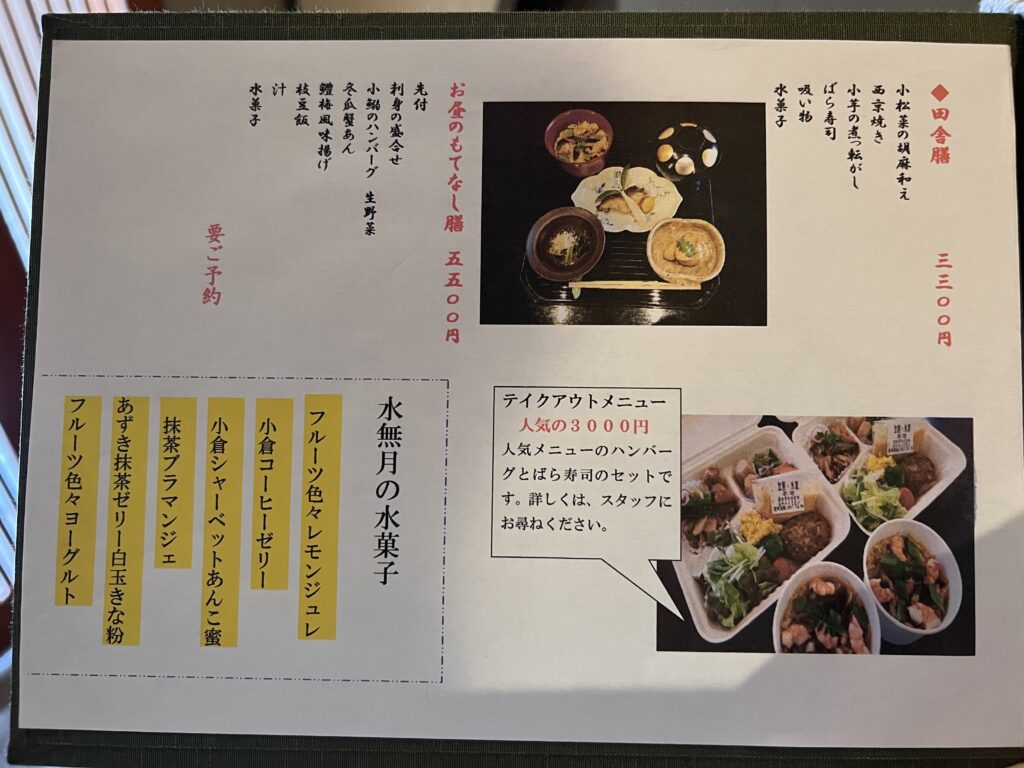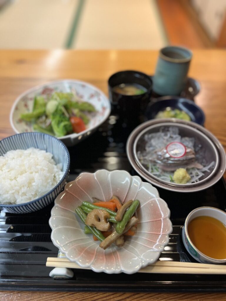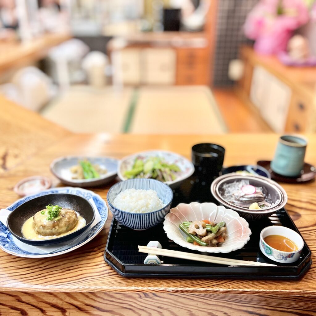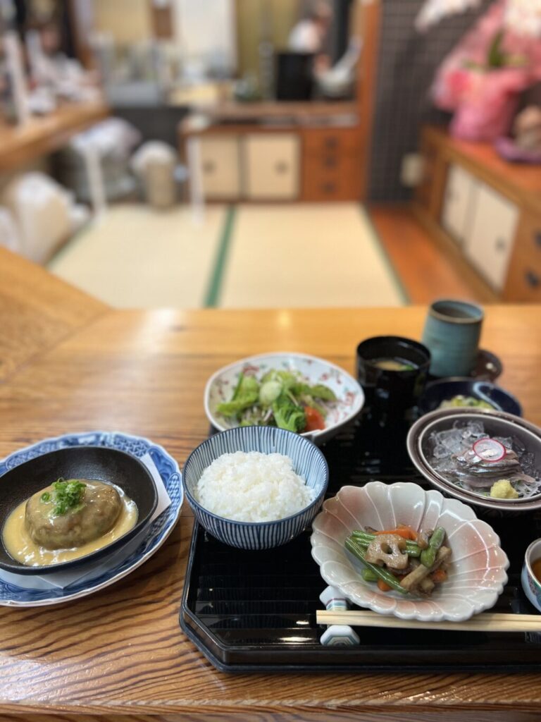 お昼のメニューは、小鰯ハンバーグをメインに、様々な和食の膳が用意されています。