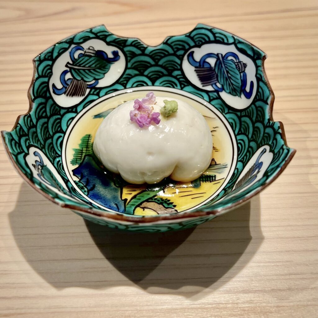 一品目は、白胡麻豆腐。お料理が引き立つ鮮やかな色絵の器に、濃厚な胡麻の香りが濃厚で、薄くひかれたお出汁もとっても美味しい。