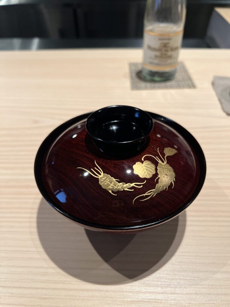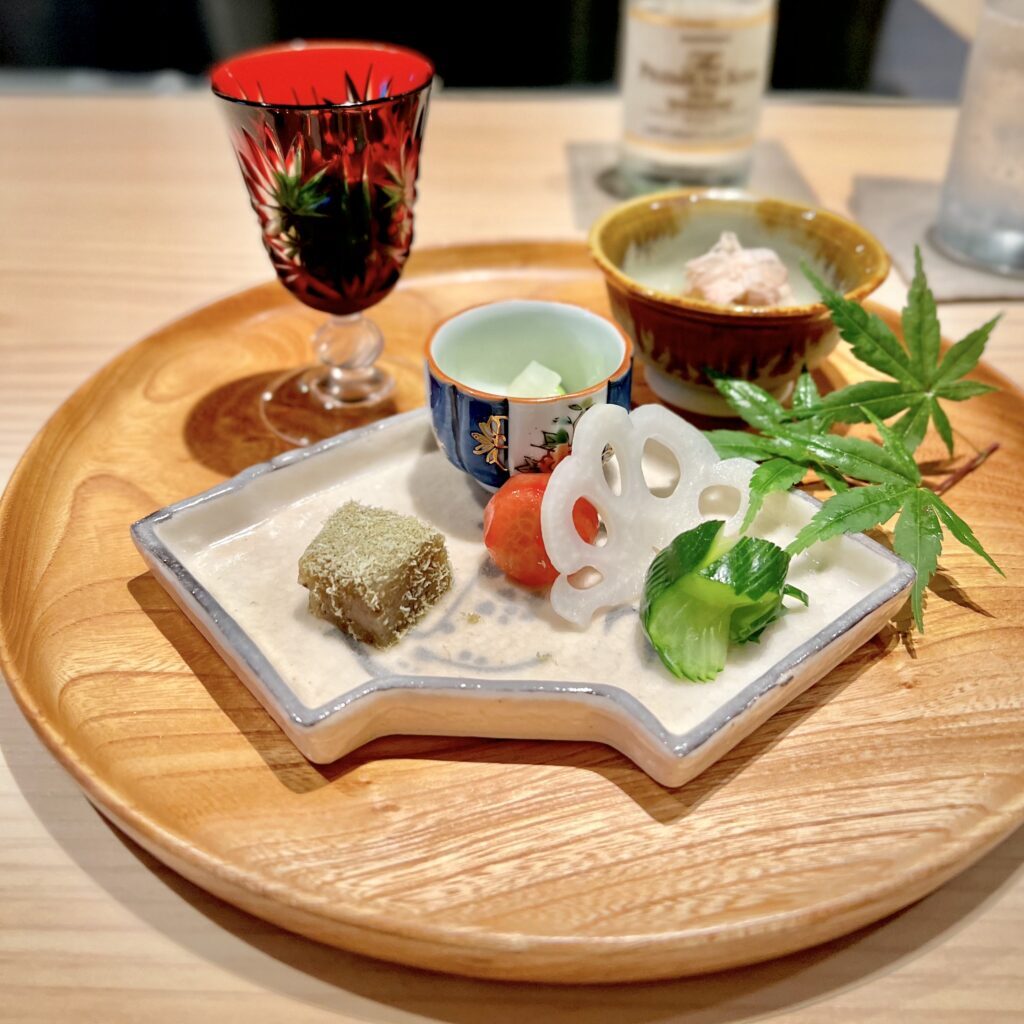 続いて、店主自らが作った木の器に盛られた先付け。細やなお料理!京都の料亭のような飾り切りもほどこされていて、一品一品がとっても丁寧です。