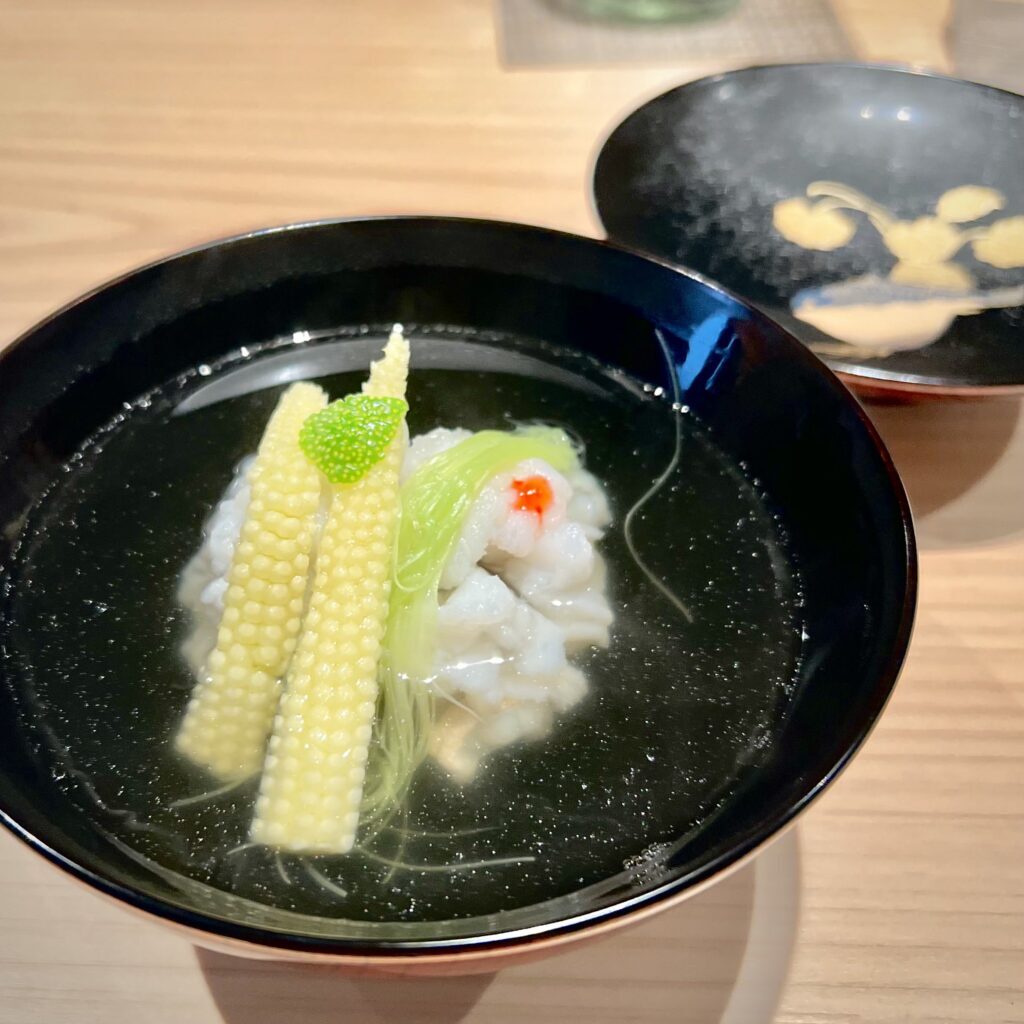 鱧と、若とうもろこしの吸い物。お出汁の味わいが優しくて沁みます。