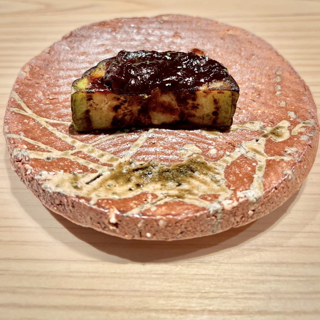狩留家茄子の鯛味噌田楽。広島県のブランド茄子、狩留家茄子のぎゅっと詰まった果肉感がたまらない!器もぽってりと厚みと表情のある信楽焼。