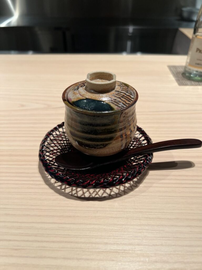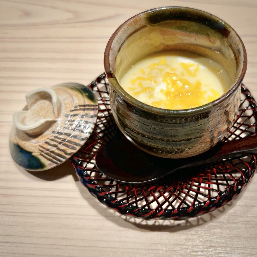 茶碗蒸しは織部焼。ラタンの茶托が夏らしく涼やかです。3種のチーズの入った茶碗蒸し。ちょっとした変化球で楽しめました。