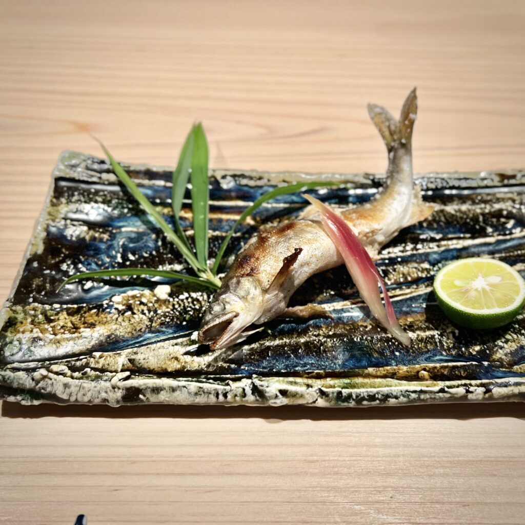 鮎の塩焼き。清流のような表情の豊かな器に盛られていて、見ていてとても美しい!!
