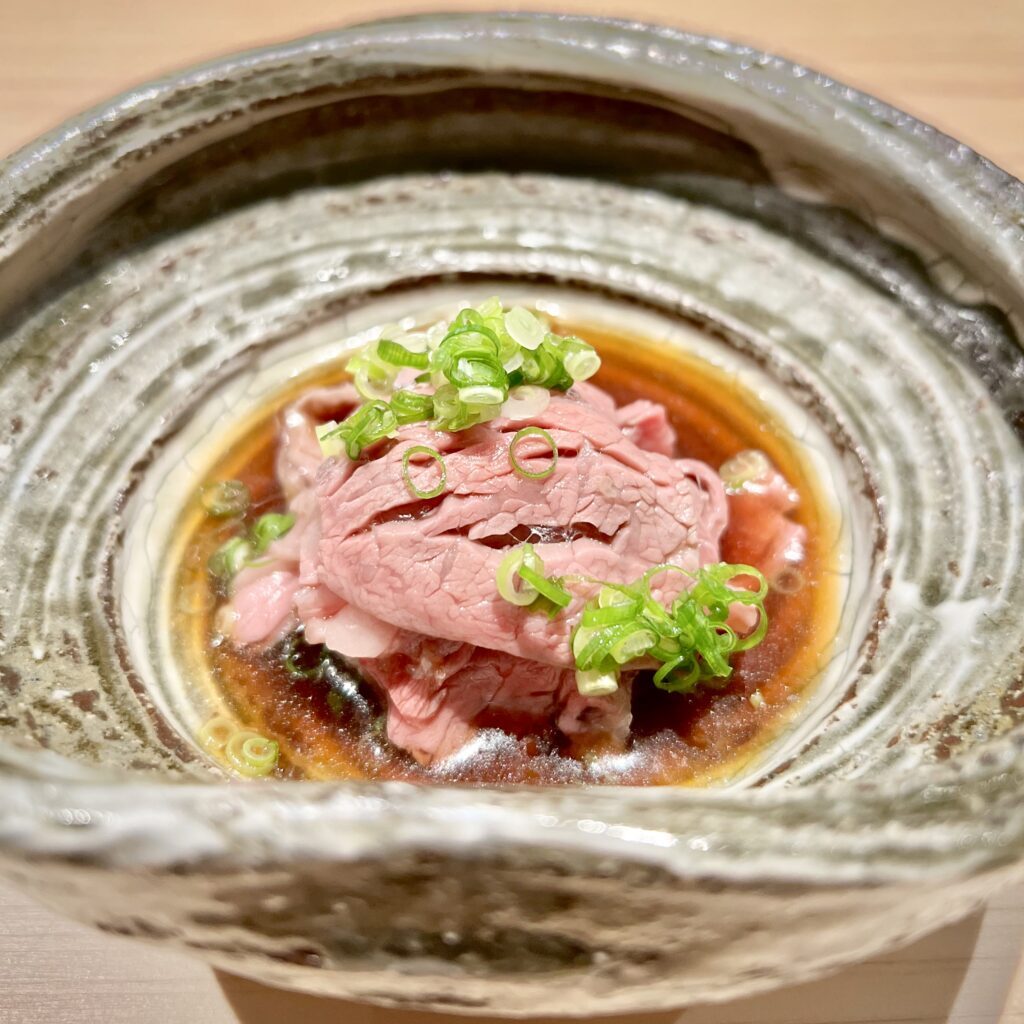 和牛のしゃぶしゃぶ。まろやかな酸味とお出汁の効いた自家製ポン酢がすっきりとした味わい。器は萩焼の鉢。