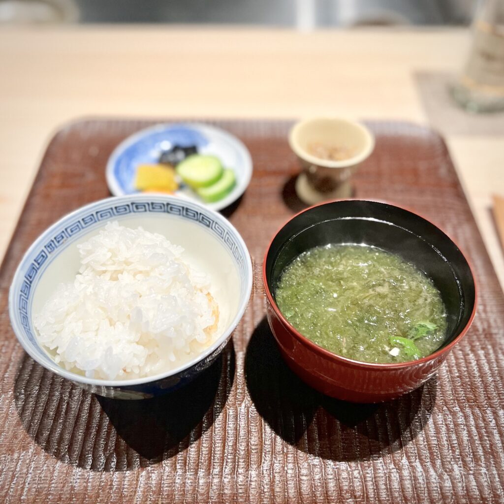 お食事でも広島県らしい、田舎味噌(麦味噌)を使ったあおさのお味噌汁と、土鍋で炊き上げたツヤツヤのご飯。自家製の糠漬け、自家製のちりめん山椒もついていて、最後まで大満足です。