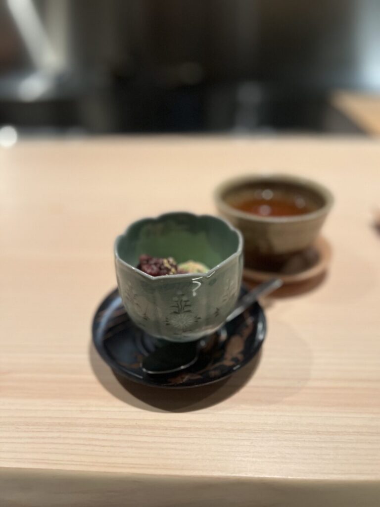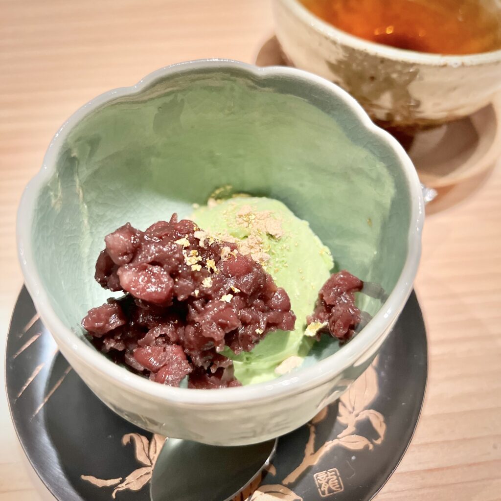 甘味は抹茶アイスにほっくりと炊き上げられたあんこ。あがりのほうじ茶とも相性抜群でした。