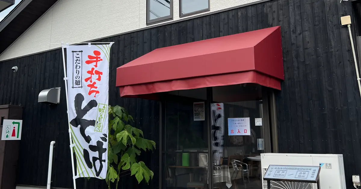 駐車場もあるため、ドライブランチにもピッタリ!赤い屋根とそばの幟が目印です。