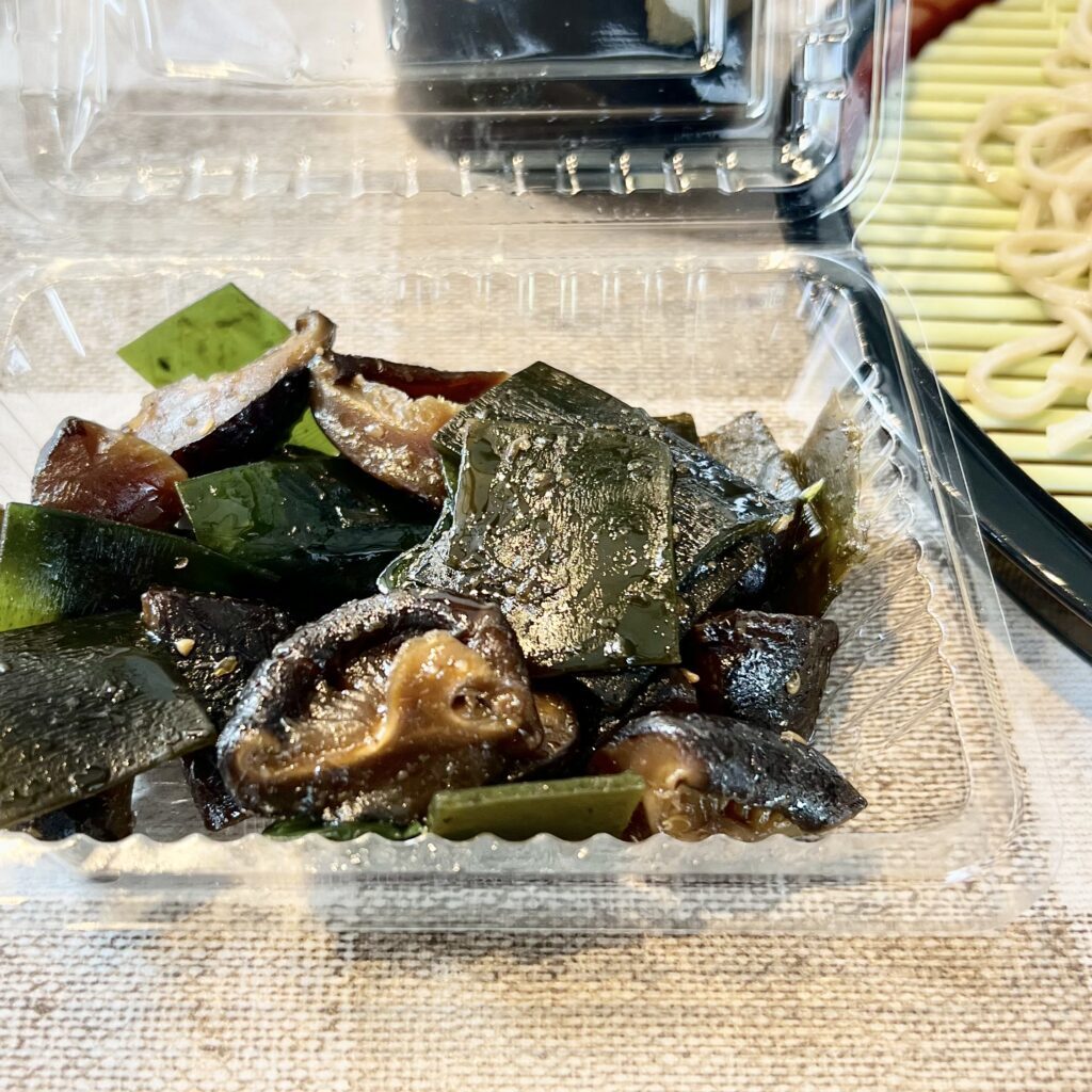 別途、出汁を取るのに利用した、椎茸やいりこで作られてた煮物や佃煮が、1パック150円で販売されています。