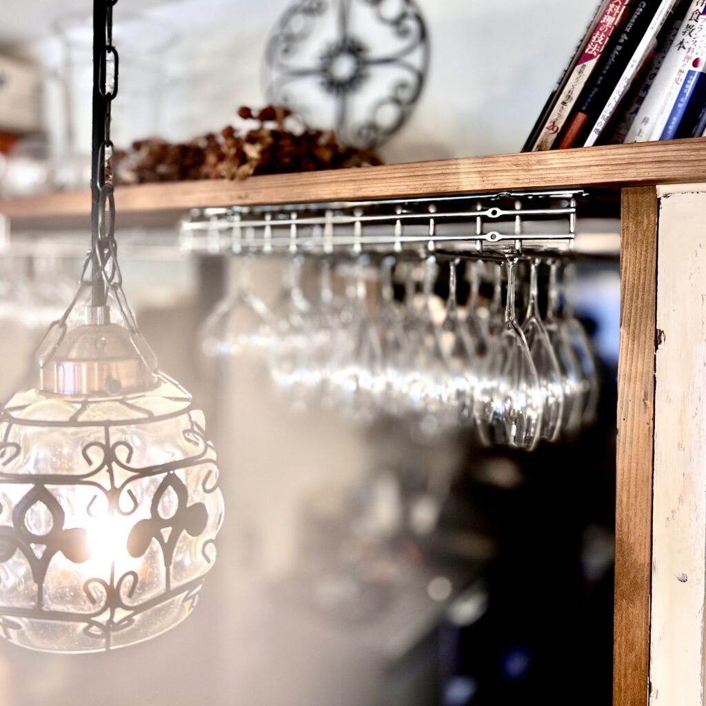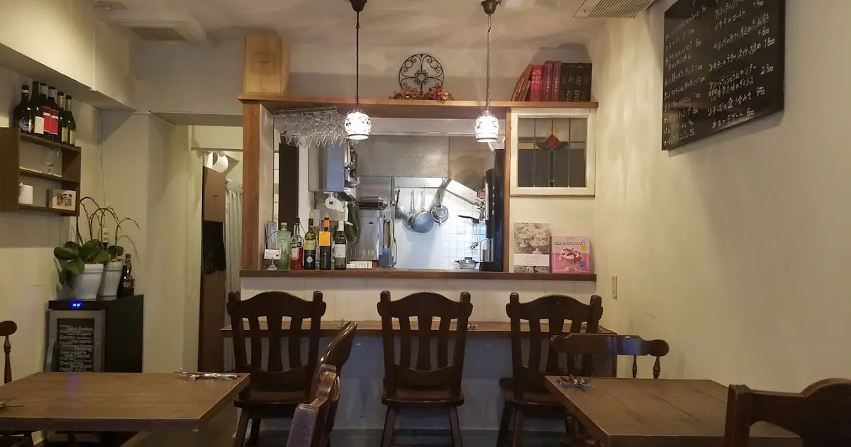 カウンターに3席、2人掛けのテーブルが2卓、4人掛けテーブルが1卓の10〜11人の小さな店内は、フランス料理の本や可愛らしいランプで、アットホームな空間。