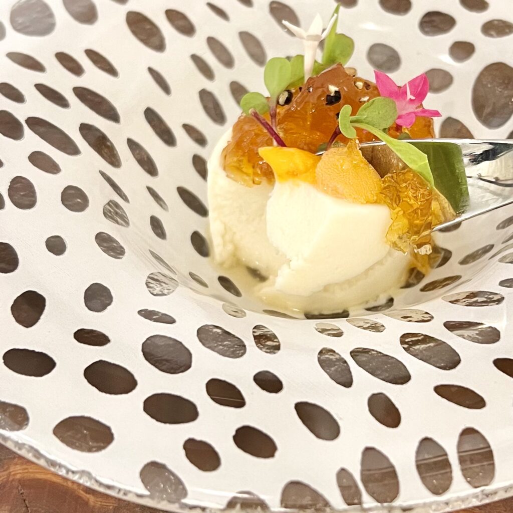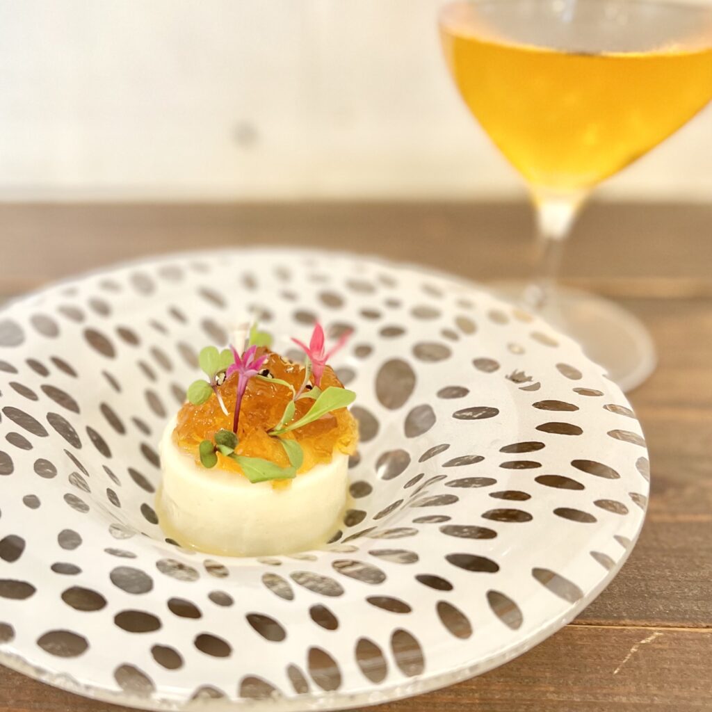 白い部分はとうもろこしのムース、そこにウニと、コンソメのジュレ。ウニととうもろこしの甘みが口いっぱいに広がって最高の一品です。食材にも、美しいもりつけにも嬉しくなる一品です。
