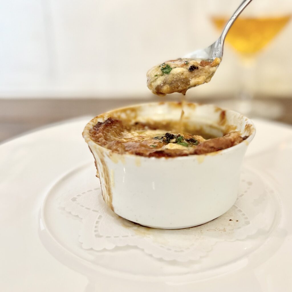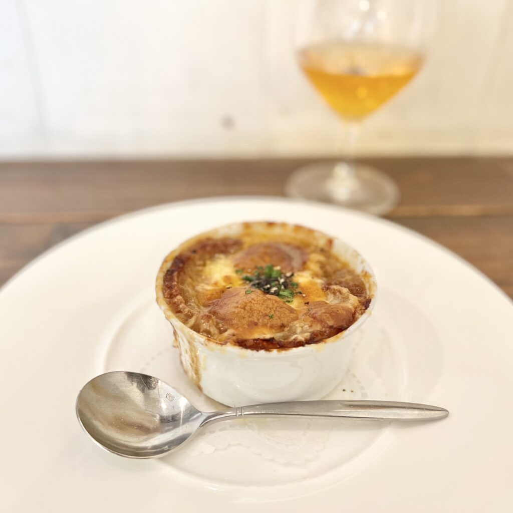 スープはオニオングラタンスープ。修行されていたお店でも人気メニューで、これがとにかく美味しい!玉ねぎをここまで飴色にして甘みを出すのに、どんなに手が掛かっているのかと思うと、幸せな気持ちでいっぱいになります。