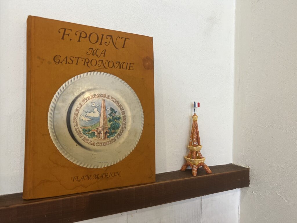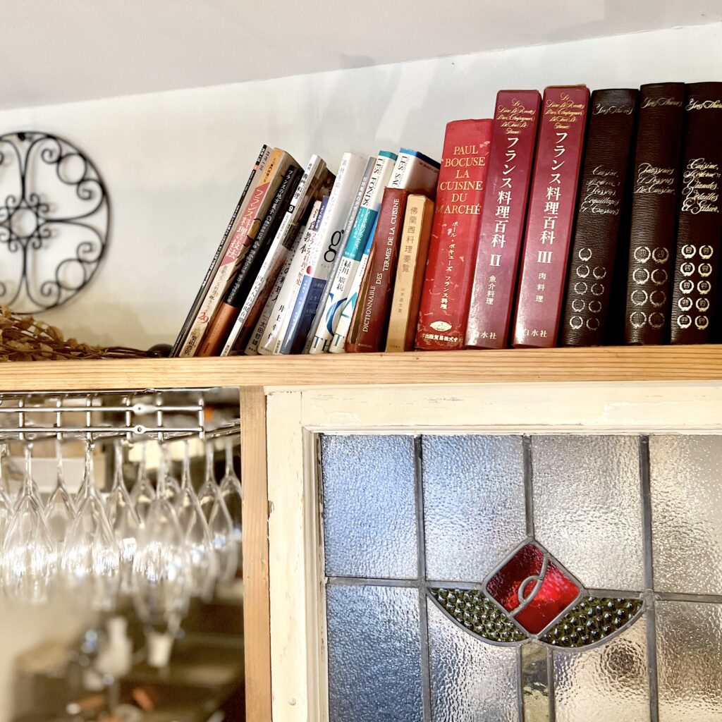 店内に飾られていた、フランス料理の本は、修行先の金賞シェフからいただいたものだそう。フランス料理の本は需要が少ないため、初版で終了することが多いそう。