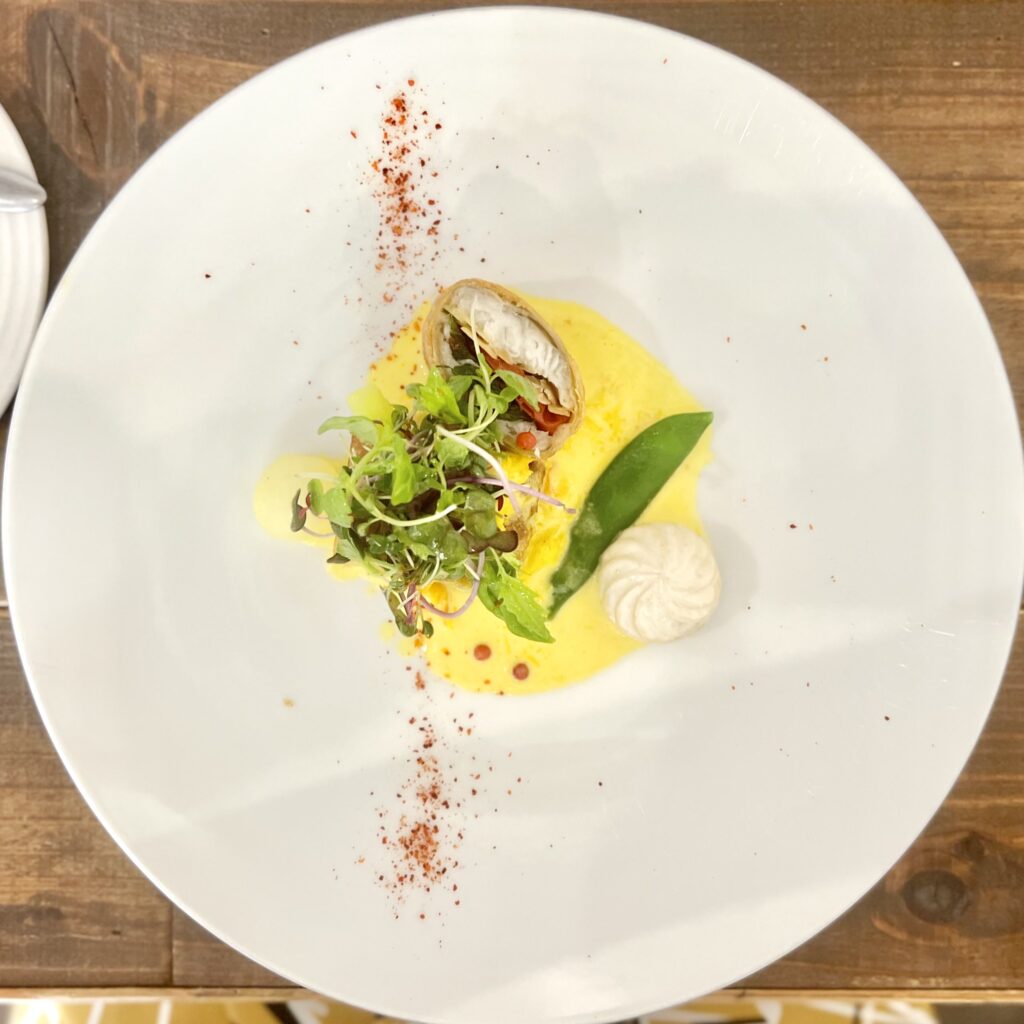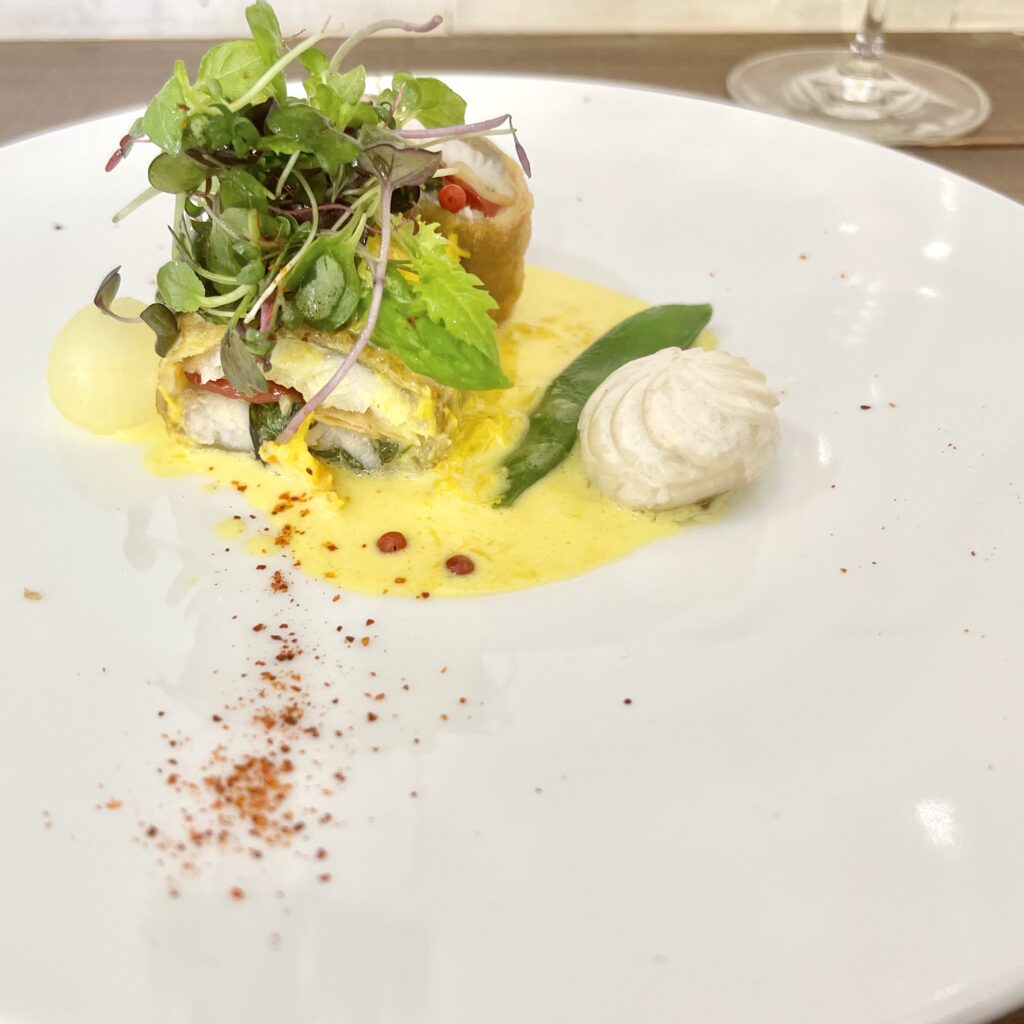 この日のメイン料理は太刀魚。自家製で作られているパーツブリックで、春巻きのように包まれています。ソースはズワイガニとサフランと、とっても贅沢!