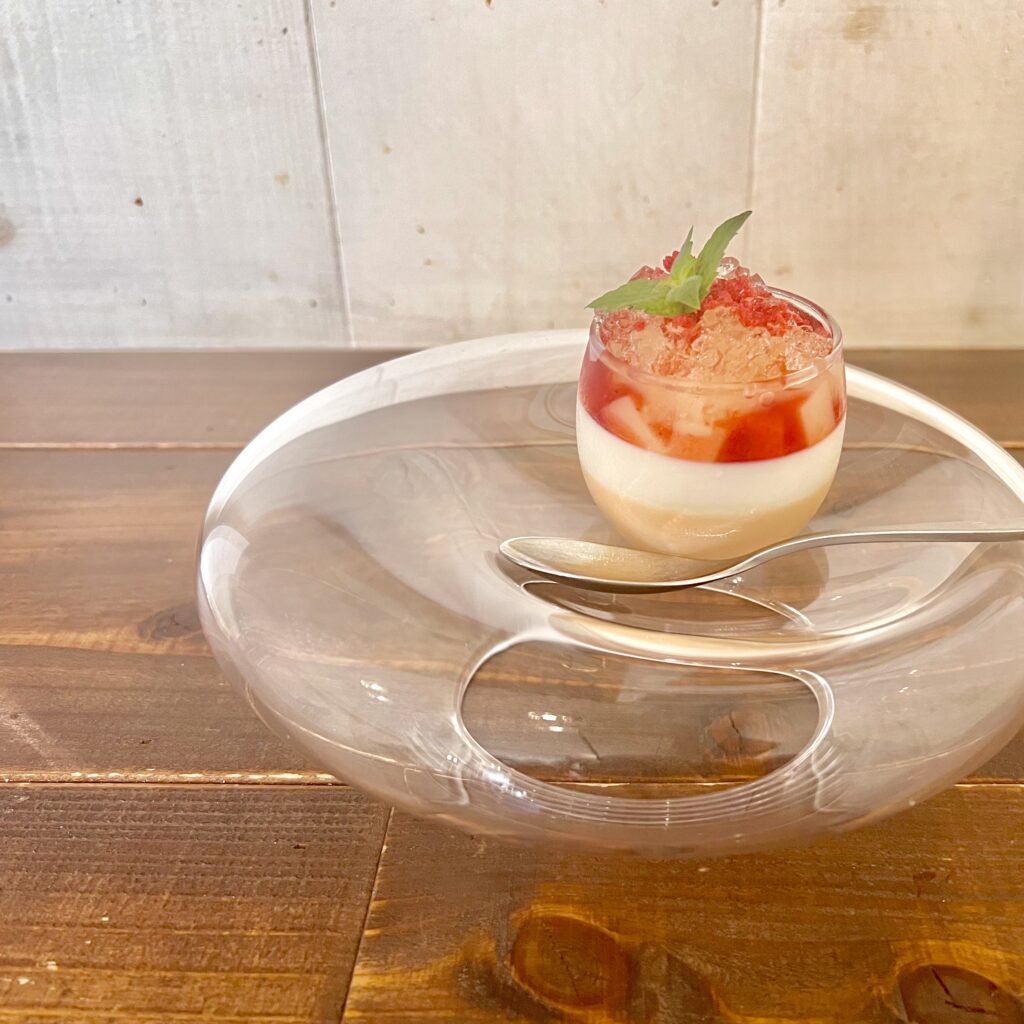 器のガラス器は元々は花器として使用されていたものを裏返しにして、ソーサーがわりにされています。