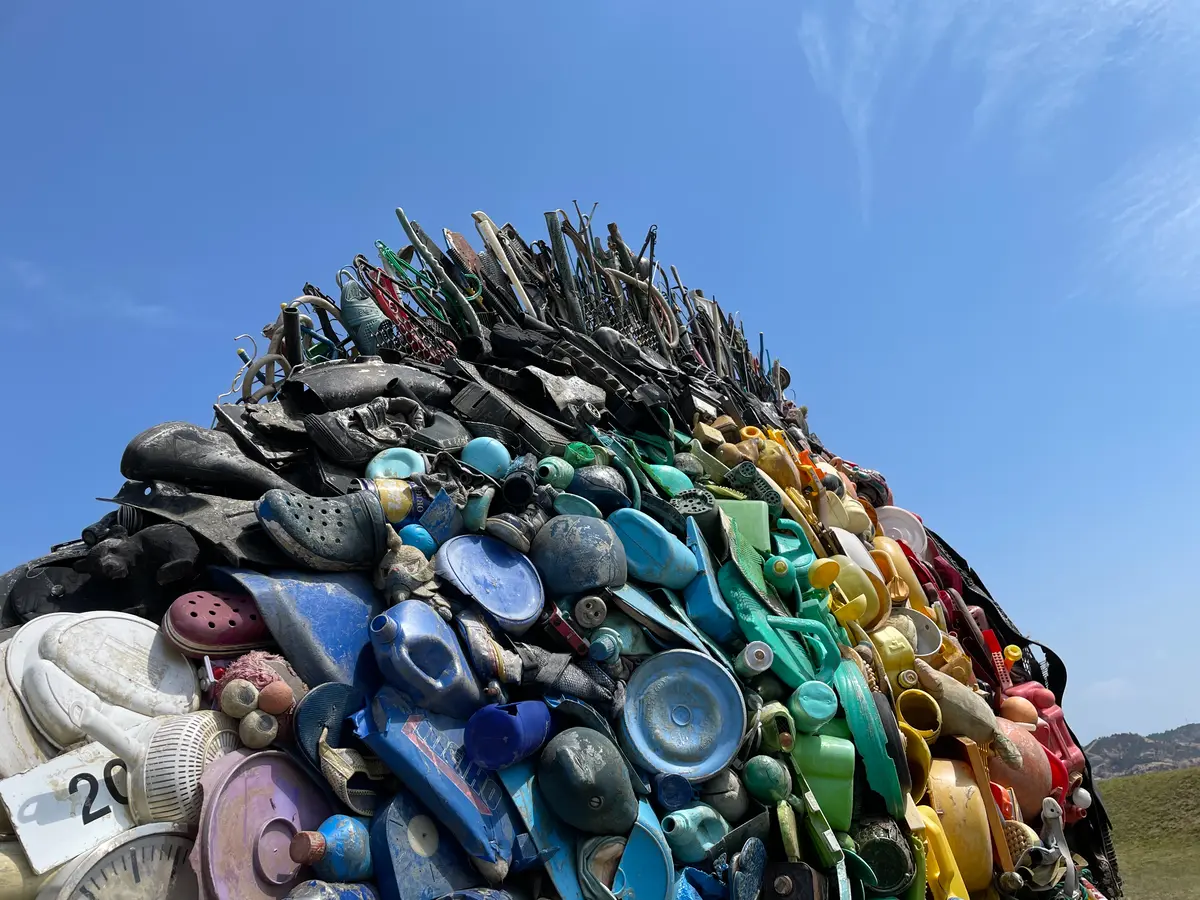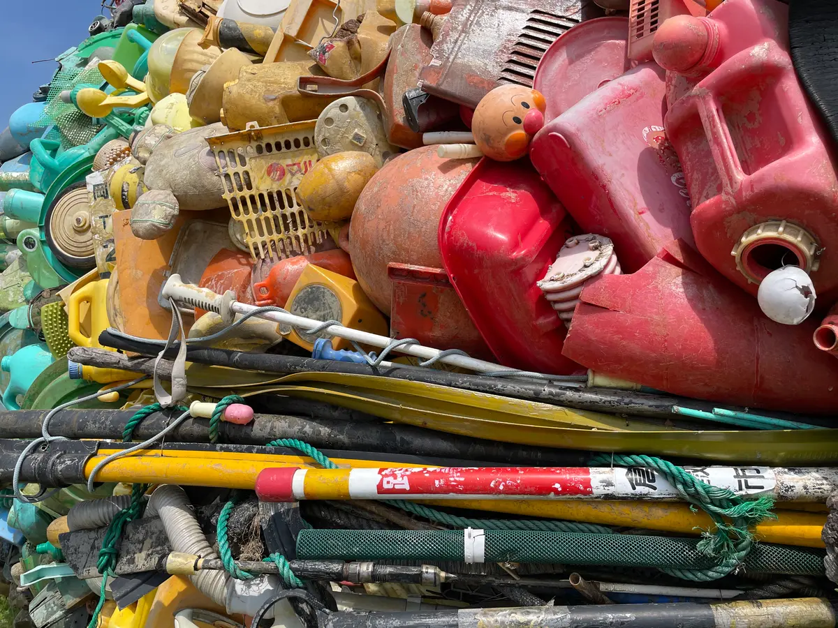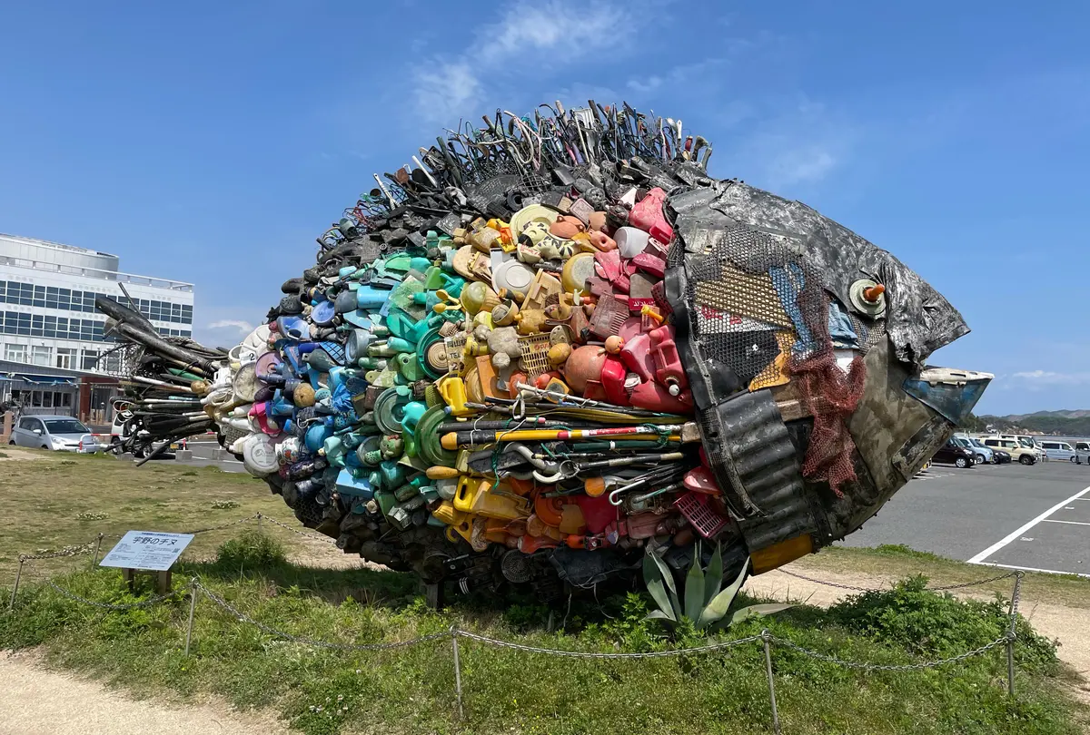 宇野港周辺の沿岸や児島湖で採取された廃棄物や漂流物を使って制作されたアート作品。関西では、クロダイをチヌと呼んでいるみたい!なるほど〜