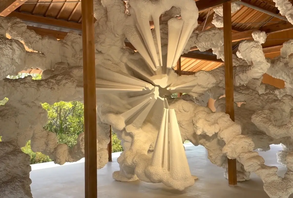 岡山県岡山市東区犬島にある「犬島『家プロジェクト』F邸」は、犬島に点在するアート作品の一つです。古い家屋の梁や柱を再利用してリノベーションされた建物内に、白い雲のようなオブジェがあり、生命が誕生する瞬間を表現しています。