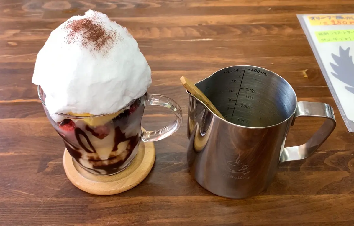 こちらはアイスやフルーツの入ったカップの上に綿菓子が乗っています!備中松山城の雲海の風景をモチーフにしているそう🏯アツアツのコーヒーをかけて、甘いと苦いの融合でめちゃうまです🤤