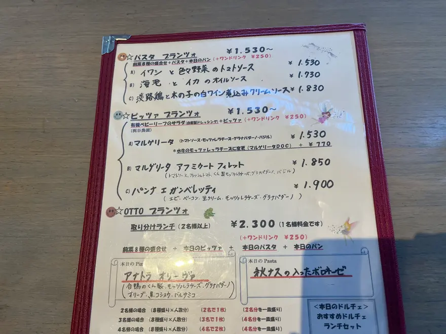 パスタプランツォには前菜8種の盛合わせ、本日のパン(3つ)、ピッツァプランツォには有機ベビーリーフのサラダ(自家製ドレッシング)が付いてきます!