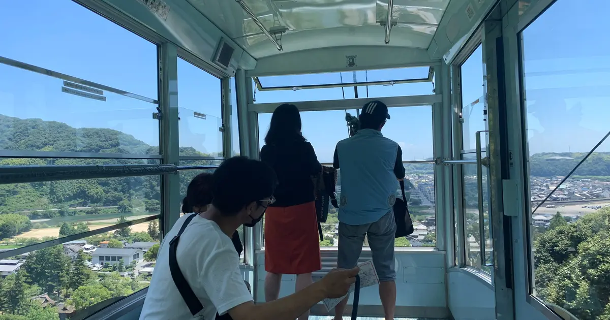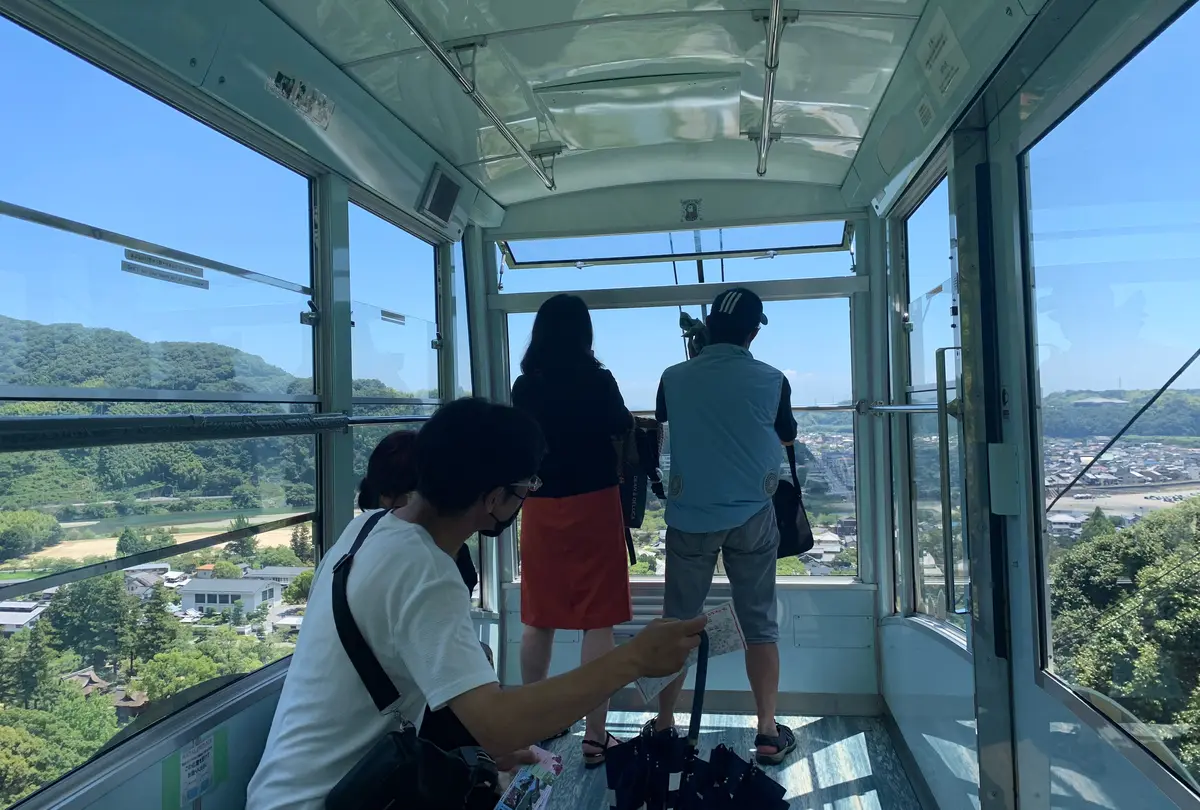 岩国市にある「岩国城ロープウエー」は、山麓駅から山頂駅までを結ぶロープウエーです。窓からは岩国の街や瀬戸内海、錦帯橋も見えます。15分ごとに運行しており、乗車時間はおよそ3分くらいです。