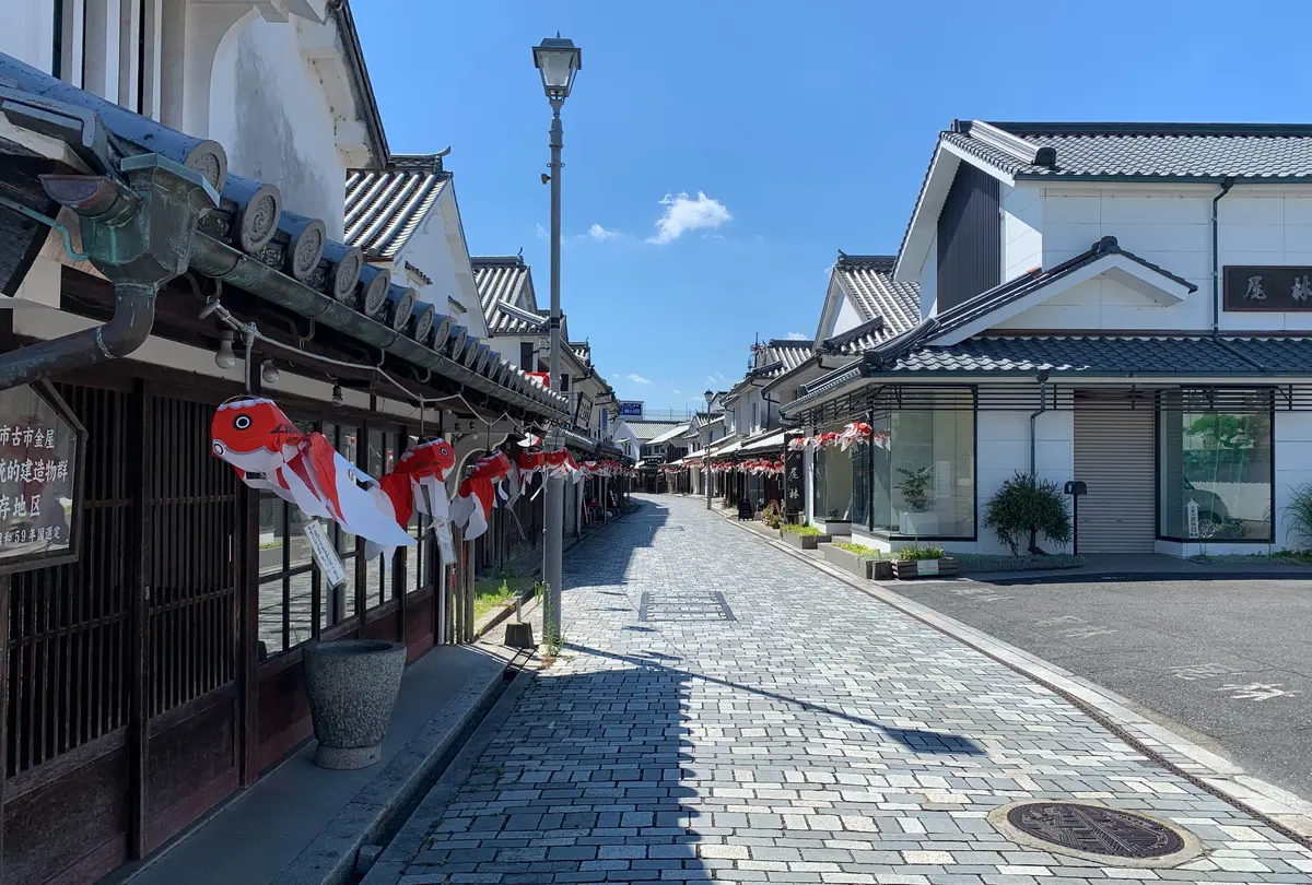 白壁の家屋と赤色の金魚ちょうちんが並んで可愛らしい街並みです🤍❤️