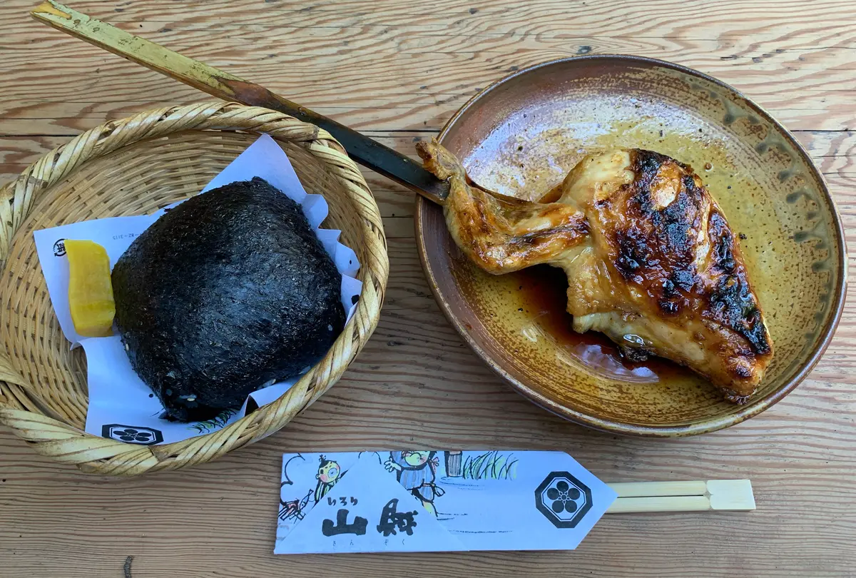 山賊むすびの中は昆布、梅、鮭。添えられているたくあんも激うまです!