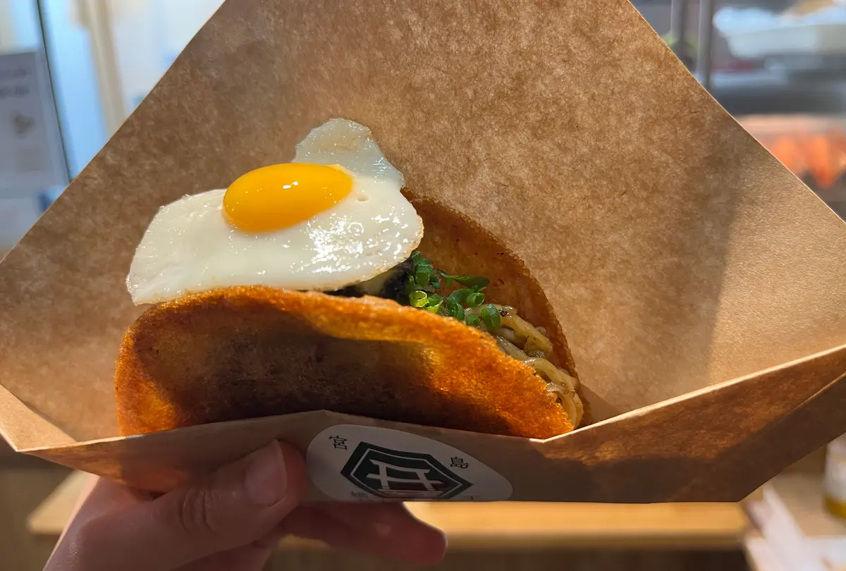 広島県廿日市市宮島町にある「宮島横丁」は、焼き牡蠣や食べ歩き仕様の”歩きお好み焼き”を販売しているお店です。特に、歩き牡蠣おこ(700円)がおすすめで、目玉焼きがプルプルで大きな牡蠣が乗っており、外の生地はパリパリで香ばしく、美味しいと評判です。