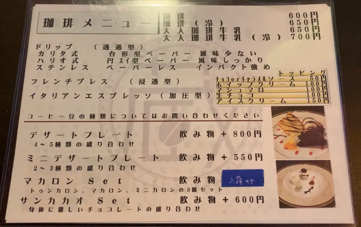 珈琲へのこだわりがすごいっ!ホットとアイスが選べて、牛乳なしか入りか選べて、さらにドリップ方法まで選べちゃう🤤スイーツも、プリンやクッキーなどありました🍮🍪