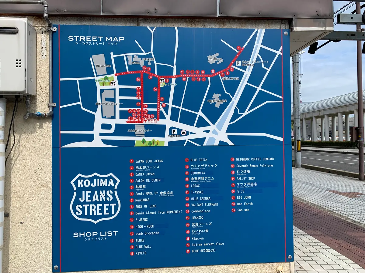 児島ジーンズストリートは味野商店街の中にあり、400メートル程の通りに地元ジーンズメーカーが軒を連ねてるスポット!