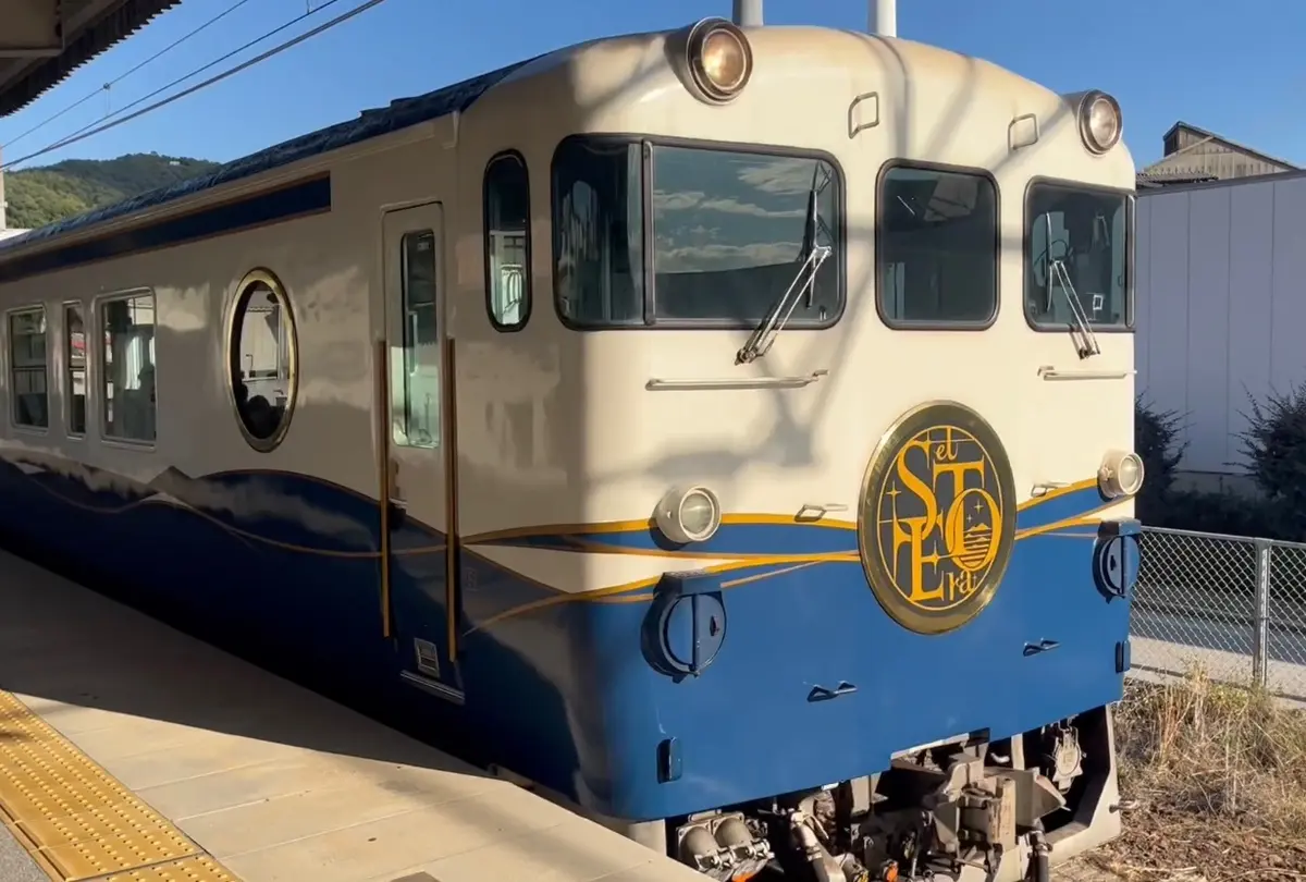 「etoSETOra」は、西日本旅客鉄道が広島駅から尾道駅間を、呉線・山陽本線経由で運行する臨時快速列車です。外観は瀬戸内の海の「青」、海岸線から見える波の「白」をイメージしたせとうちの穏やかな風景を感じさせるシックなデザインになっています。