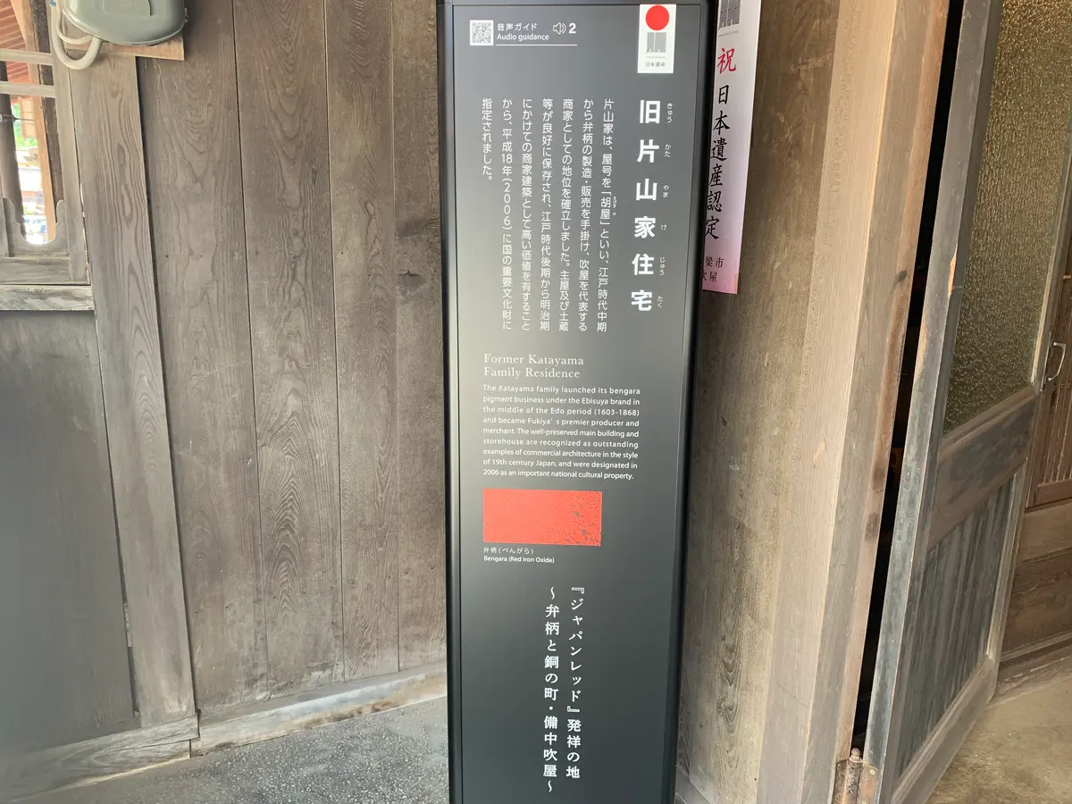 岡山県高梁市成羽町吹屋にある「旧片山家住宅」は、ベンガラ製造で栄えた片山家の本家邸宅です。建物は、国の重要文化財に指定されており、郷土館の斜め前に位置しています。実際にベンガラを製造していた場所も見学することができます。
