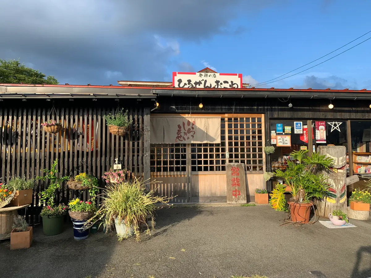 「湯本屋」は岡山県真庭市湯原温泉にある飲食店で、お好み焼きなどのメニューが楽しめます。宿から歩いて5分ほどの場所にあり、風情ある外観が魅力的です。