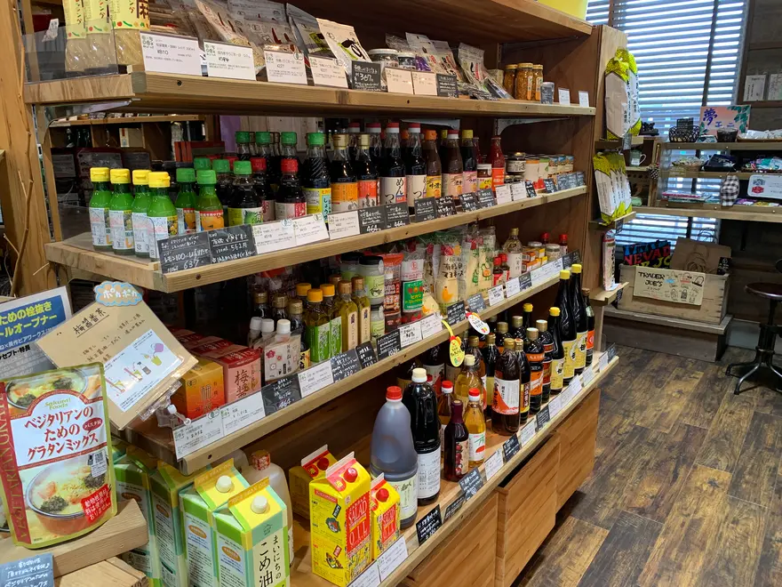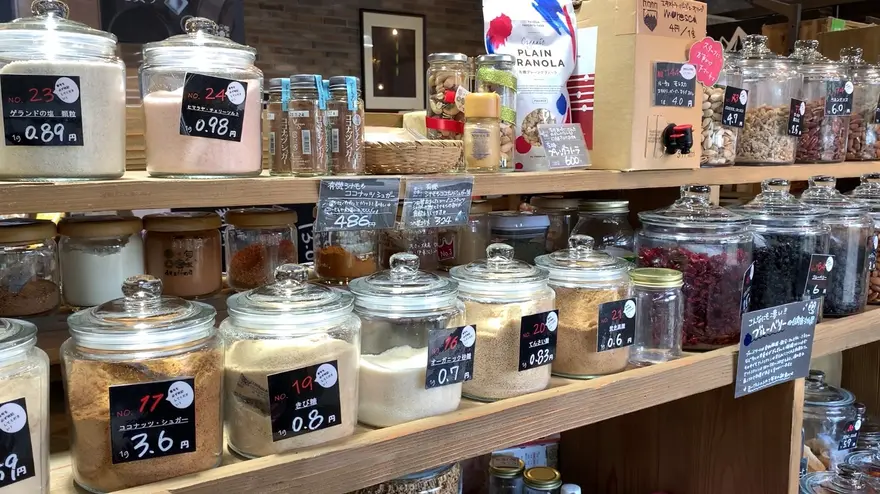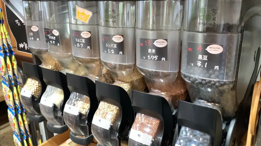 真庭あぐりガーデンにある「旬の蔵 dezi-na」は、ゴミを減らすエコな買い物が楽しめる地域の食品蔵です。出汁やお米など、必要な分を量り売り方式で購入することができ、種類も豊富。野菜や果物など、新鮮な食材を求める方にもおすすめのスポットです。