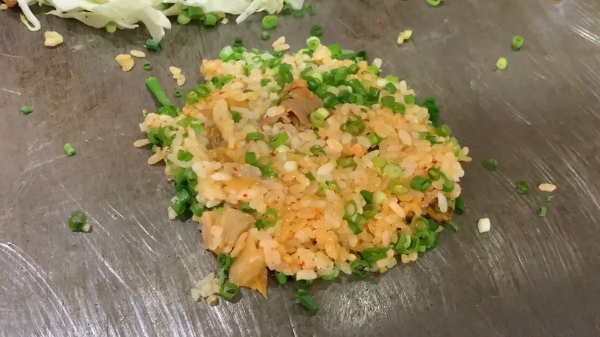 キムチとお米、他にももちや豚肉、ネギなど。具沢山のお好み焼きです!😋