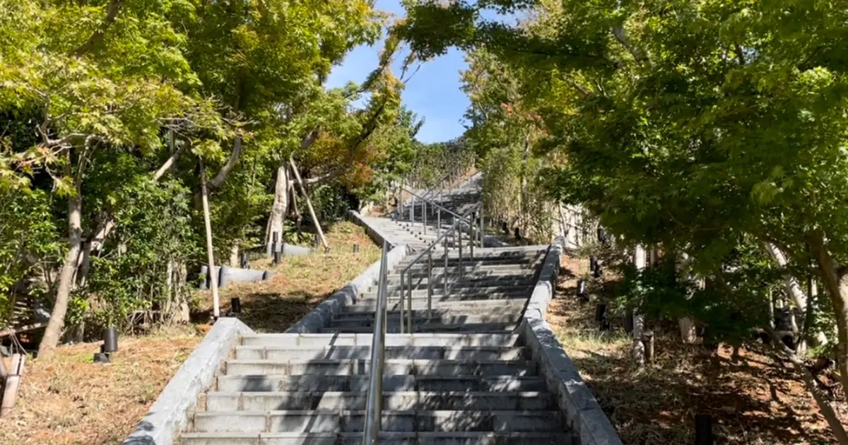 階段沿いにあるもみじはまだ紅葉してなかった🍁