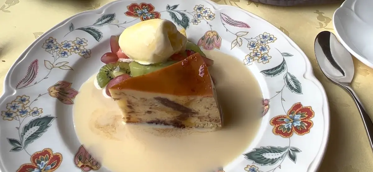 プリンの生地とスポンジが合わさってケーキみたいになっているデザート。アイスとフルーツまで添えられていてボリュームもあって嬉しい一品です💕