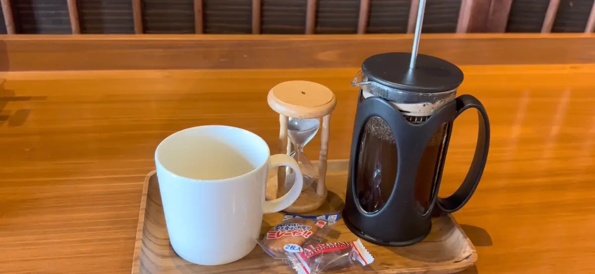 砂時計で時間を数えながら、コーヒーを抽出していくスタイル⏳自分でプレスしてこだわりのコーヒーが飲めます!