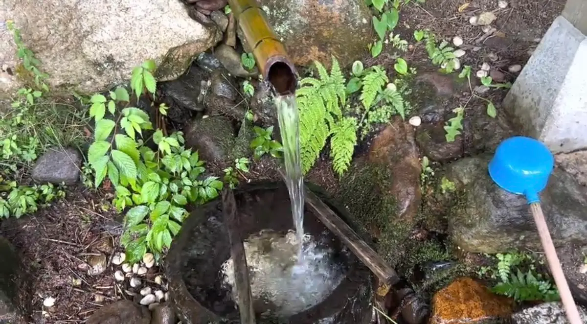 インフォメーションの横に、竹筒から随時流れているお水が、冷泉の水汲み場です。