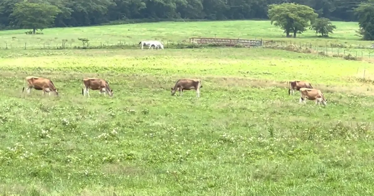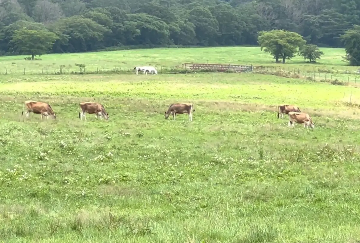 広大な草原の奥でのんびりと草を食べている牛さん🐂🌱