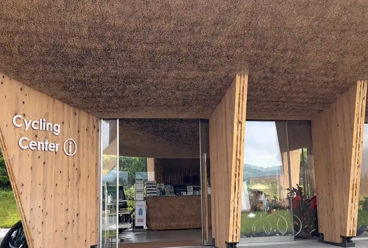 岡山県真庭市蒜山上福田にある「GREENable HIRUZEN」は、サステナブルの価値をより多くの人に知ってもらうための発信拠点施設です。建物はCLTを多用したパビリオンで、国立競技場の設計に携わった隈研吾さんがデザインを監修。中には作品も置かれており、木のいい香りや五感を感じられる空間となっています。また、サイクリングセンターもあり、自転車をレンタルして周辺を散策することもできます。