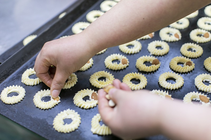 絞り出し袋を使って生地をスタンプのように絞り、アーモンドをちょこんとのせたらオーブンへ。
