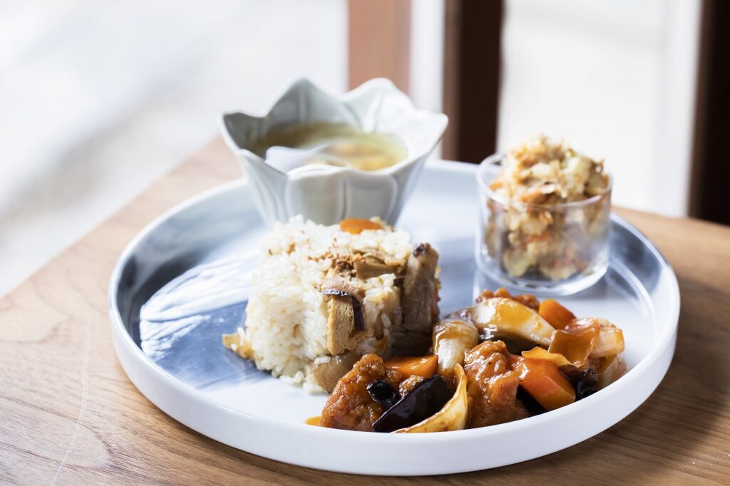 料理に使用するのは、無肥料・無農薬で育てた野菜、ミートや豆乳といった植物由来の食材、そして無添加調味料だ。ベジブロスでだしをとったひよこ豆のスープ、おからこんにゃくを甘酸っぱいあんに絡めた酢豚風、豆乳マヨネーズで味付けたさつまいものポテトサラダ、島の郷土料理「もぶり」をベースにした混ぜご飯など、丁寧な下ごしらえから生まれる料理はどれも親しみやすい味付け。
